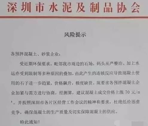 受近期商品混凝土原材料(碎石、砂)持續(xù)漲價的影響,深圳市水泥及制品協(xié)會終于發(fā)布商品混凝土、預(yù)拌砂漿企業(yè)風(fēng)險(xiǎn)提示函,表示,因原材料價格持續(xù)上漲,商品混凝土價格建議,上調(diào)70元/立方米。目前,深圳市及周邊地區(qū)大多數(shù)混凝土企業(yè)混凝土價格已經(jīng)上調(diào),瘋狂的石頭再次上演【漲、漲、漲】何時能夠穩(wěn)定一來,還有待觀望。