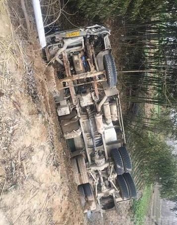 記者趕到現(xiàn)場從很遠地方就可以看到一輛攪拌車橫躺在渠中,零部件散落一地,攪拌車有不同程度的受損。