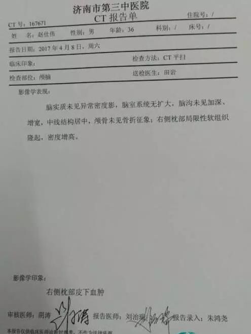 濟(jì)南市第三中醫(yī)院CT報(bào)告單顯示,趙先生右側(cè)枕部局限性軟組織隆起,密度增高。趙先生的同事周先生對(duì)記者說:“看著朋友被打成這樣,我心里很過意不去,所以我現(xiàn)在到醫(yī)院照顧他?!?/span>