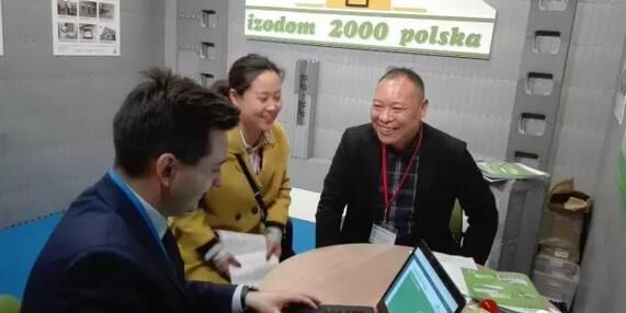 聯(lián)盟副主席采明勇、佛山市筑建集成房屋副總謝力丁、克絡(luò)蒂孫安妮在與展商交談