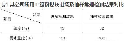 優(yōu)質(zhì)的粉煤灰摻入混凝土可明顯地改善混凝土的和易性,當(dāng)粉煤灰摻量大于膠材總量的5%~10%時,效果極為明顯?,F(xiàn)今在混凝土實際生產(chǎn)中,粉煤灰摻量往往達(dá)到20%,有的甚至高達(dá)30%,但混凝土的和易性卻不盡人意。抽取原材料進(jìn)行檢測時,發(fā)現(xiàn)粉煤灰的檢測結(jié)果經(jīng)常不滿足標(biāo)準(zhǔn)要求或者與驗收時的結(jié)果相差甚遠(yuǎn)。現(xiàn)以某公司所用Ⅱ級粉煤灰進(jìn)場及抽樣常規(guī)檢測結(jié)果進(jìn)行對比,見表1。
