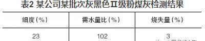 混凝土公司大多數(shù)使用的粉煤灰顏色與水泥相近,多呈灰色;也有部分粉煤灰顏色較深呈灰黑色,這種粉煤灰一般細(xì)度較細(xì)或含碳量較高。但總會發(fā)現(xiàn)一些深顏色的粉煤灰檢測結(jié)果與常理不符,如某公司某批次灰黑色Ⅱ級粉煤灰檢測結(jié)果見表2。