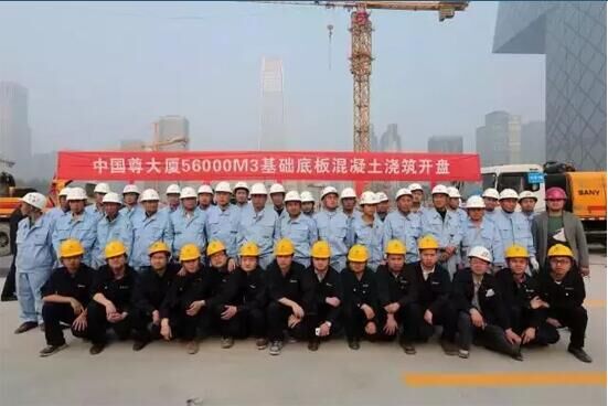 為了保障此次澆筑的順利完成,三一派出了20多名服務工程師駐守工地,保證每臺設備至少有一名服務工程師進行專職服務。2014年4月27日,在18臺三一車載泵、20多臺三一攪拌車的全力保障下,“中國尊”項目完成了最大底板澆筑,將標號60以上的高粘稠度混凝土一次性泵送到位。這次澆筑持續(xù)了96個小時,一次性連續(xù)澆筑混凝土總量達5.6萬立方米,在連續(xù)澆筑期間,實現(xiàn)了零事故、零投訴,澆筑一次成優(yōu),創(chuàng)造了北京建筑業(yè)的新奇跡。