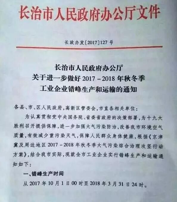 山西省長(zhǎng)治市也發(fā)布《關(guān)于進(jìn)一步做好2017-2018秋冬季工業(yè)企業(yè)錯(cuò)峰生產(chǎn)和運(yùn)輸?shù)耐ㄖ贰R笞?017年10月1日00時(shí)起至2018年3月31日24時(shí),水泥(含粉磨站)等建材行業(yè)企業(yè)全部停產(chǎn)。