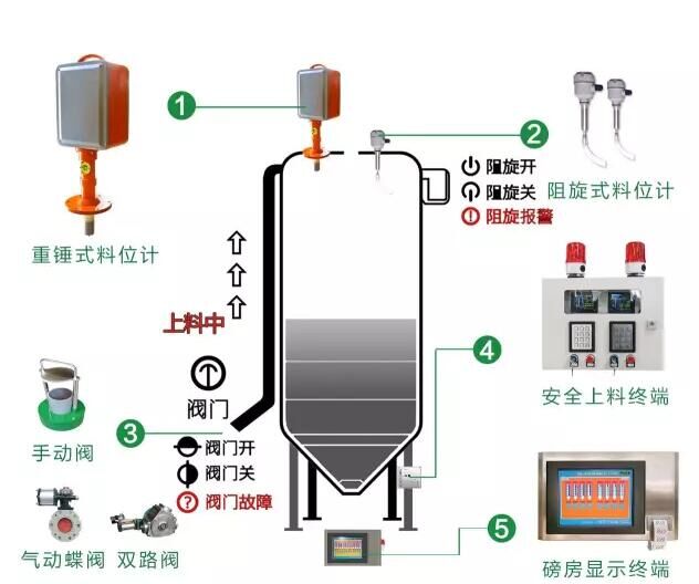 上料口側(cè):安全上料控制終端、上料安全閥,每個(gè)料倉各1個(gè),各個(gè)終端通過網(wǎng)絡(luò)連接。