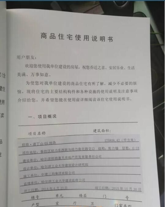 在哈爾濱市城鄉(xiāng)建設(shè)委員會(huì)官方網(wǎng)站上,記者查到了“招商諾丁山 05 地塊 8#樓”的《哈爾濱市工程竣工驗(yàn)收備案證》,備案號(hào)為黑建備字號(hào)2015380,建設(shè)單位為哈爾濱招商嘉天房地產(chǎn)開發(fā)有限責(zé)任公司,施工單位為中建三局集團(tuán)有限公司,監(jiān)理單位為哈爾濱工業(yè)大學(xué)建設(shè)項(xiàng)目管理公司,開竣工日期為2014年6月15日-2015年12月18日,備案日期2015年12月18日。