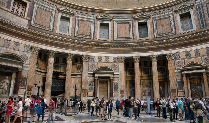 穹頂頂部的矢高和直徑一樣,也是43.3米,這樣,萬神殿的剖面恰好可以容得下一個(gè)整圓,而它的內(nèi)部墻面兩層分割也接近于黃金分割,因此它常被作為通過幾何形式達(dá)到構(gòu)圖和諧的古代實(shí)例。