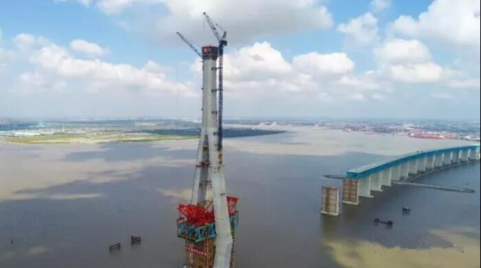 在國內(nèi),大部分橋梁主塔高度都在260米以下,300米以上極其少見,而本次完成施工的大橋北側(cè)主塔,建設(shè)整體高達(dá)330米,相當(dāng)于110層高樓,為國內(nèi)最高主塔,同時也是世界公鐵兩用斜拉橋中最高主塔;混凝土澆筑達(dá)7.3萬方,鋼筋1.1萬噸,體量也為世界最大。