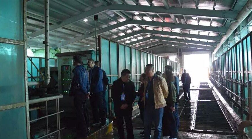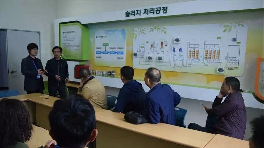 10日下午考察團一行到達(dá)韓國最大的垃圾填埋廠,首先參觀生活食品垃圾運輸車輛沖洗設(shè)備,此套設(shè)備由兩組車輛沖洗線構(gòu)成,每條線長度為50米,當(dāng)車輛駛?cè)胫粮袘?yīng)區(qū)設(shè)備自動啟動對車輛全方位立體式?jīng)_洗,沖洗中掉落的異物經(jīng)特制排泥裝置送至中央皮帶輸送機。車輛完成沖洗后駛出前對車身噴淋消毒去異味藥劑,最后烘干后離開。每日完成一千車次的清洗消毒工作。