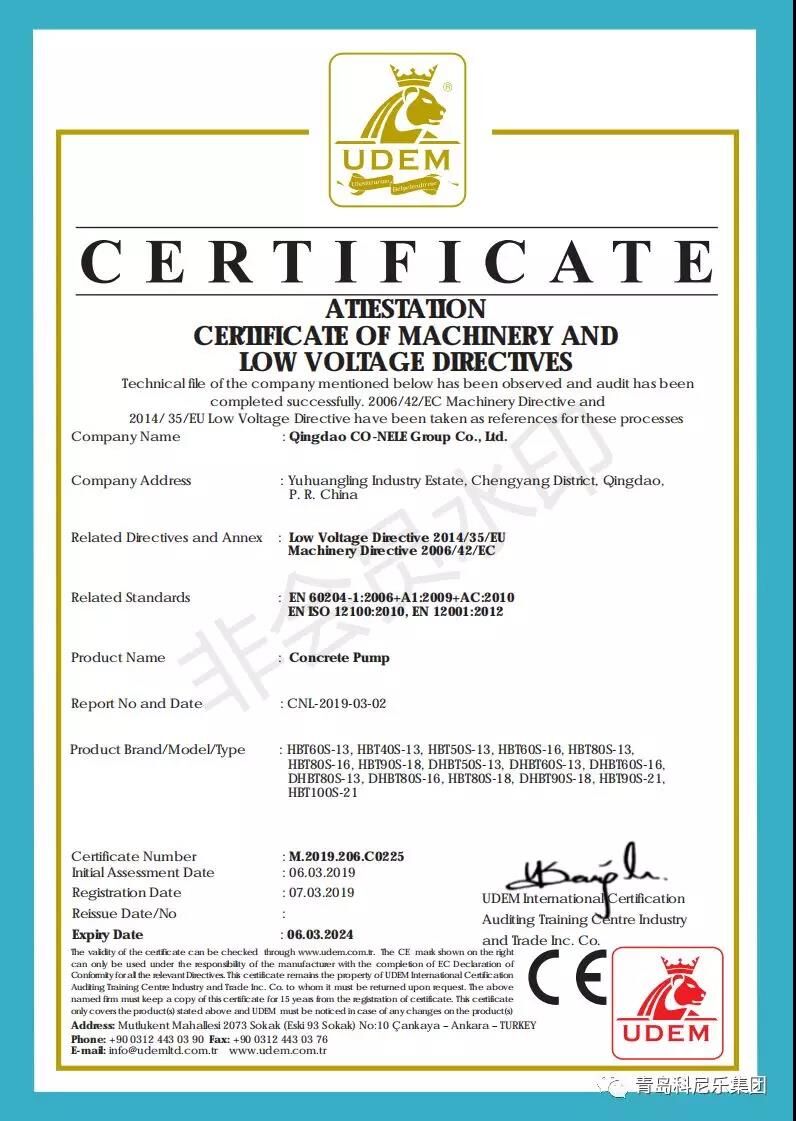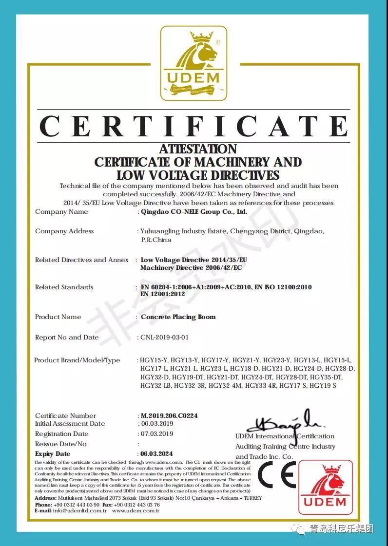 陽春三月,微風習習,科尼樂集團的明星產(chǎn)品混凝土泵、混凝土布料機順利通過了歐盟CE認證,這也代表著科尼樂集團在提升產(chǎn)品品質(zhì)、拓展銷路、提升企業(yè)競爭力方面邁入了新臺階。