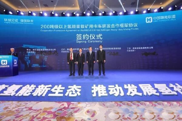 濰柴與國(guó)能集團(tuán)合作開(kāi)展的200噸級(jí)氫能礦卡項(xiàng)目簽約儀式