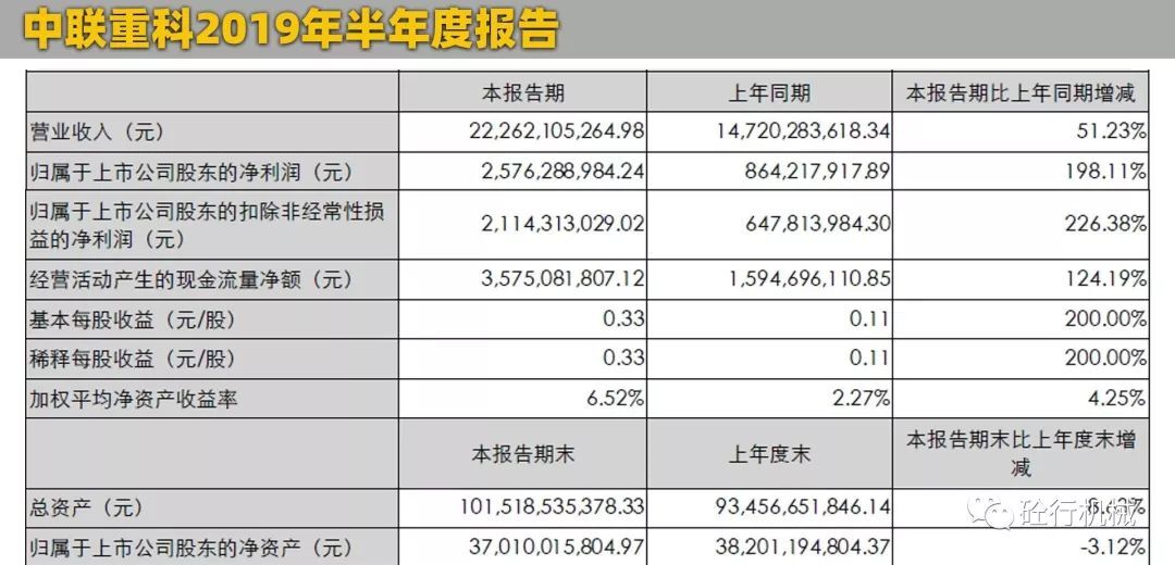 2019年上半年?duì)I業(yè)收入:222.62億元8月30日晚,中聯(lián)重科官方發(fā)布了2019年半年度報(bào)告。報(bào)告顯示,中聯(lián)重科上半年實(shí)現(xiàn)營業(yè)總收入222.6億元,同比增長51.23%;包括海外市場實(shí)現(xiàn)營業(yè)收入16.84億元,同比增長2.61%。歸屬于上市公司股東的凈利潤25.76億元,同比增長198.11%。相比較上面的徐工機(jī)械,雖然總營業(yè)額相差了88個(gè)多億,但是,凈利潤比徐工多了2.93億元。所以,從盈利能力來說,中聯(lián)表現(xiàn)比徐工要好。中聯(lián)重科的優(yōu)勢產(chǎn)業(yè)主要集中在混凝土機(jī)械、塔式起重機(jī)械、環(huán)衛(wèi)機(jī)械、農(nóng)業(yè)機(jī)械這四個(gè)領(lǐng)域?yàn)橹鳎渲?,建筑起重機(jī)械、長臂架泵車保持行業(yè)第一,汽車起重機(jī)國內(nèi)市場份額較年初增長6.8%。從目前中聯(lián)的發(fā)展趨勢來看,也在積極的擴(kuò)展高空作業(yè)平臺(tái)、土方機(jī)械、機(jī)制砂、干混砂漿、噴射機(jī)械手等新興業(yè)務(wù)。與此同時(shí),中聯(lián)重科目前也在積極轉(zhuǎn)型,打造人工智能和智能制造,中聯(lián)重科塔機(jī)智能工廠穩(wěn)步達(dá)產(chǎn),高空作業(yè)平臺(tái)臂式智能產(chǎn)線實(shí)現(xiàn)量產(chǎn),攪拌車智能制造產(chǎn)業(yè)園、液壓關(guān)鍵元件產(chǎn)業(yè)園處于規(guī)劃建設(shè)中。作為老牌的國產(chǎn)工程機(jī)械品牌,中聯(lián)重科一直以來擁有很好的品牌口碑,特別是在混凝土機(jī)械領(lǐng)域,擁有眾多的明星產(chǎn)品,碳纖維長臂架泵車,國內(nèi)首創(chuàng),大受市場歡迎。
