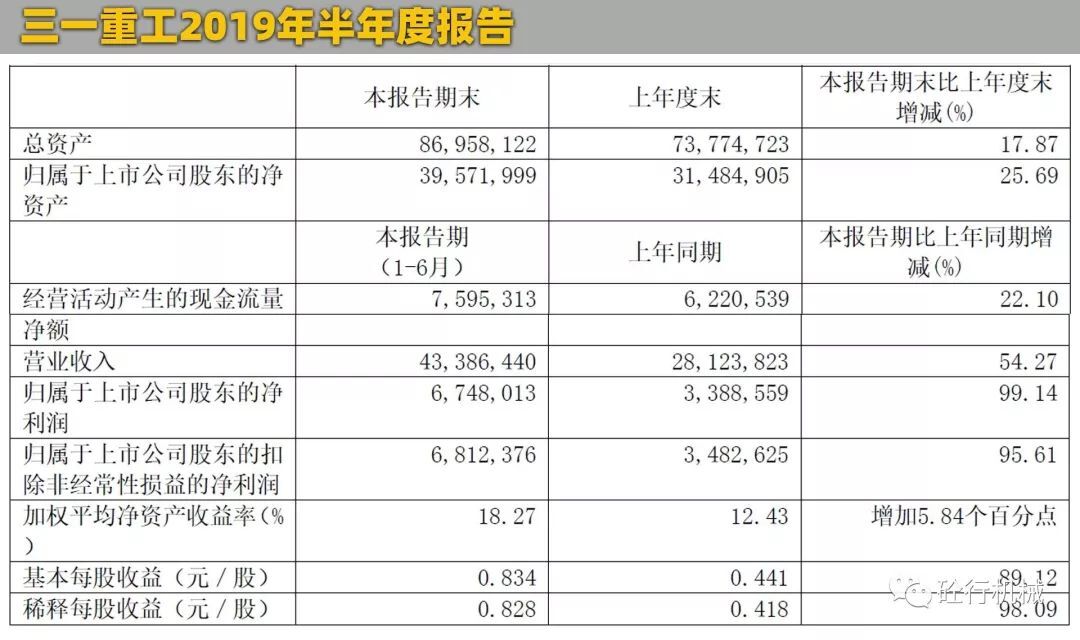 8月29日晚,三一重工官方發(fā)布了其2019年上半年業(yè)績公告。上半年,公司實(shí)現(xiàn)營業(yè)總收入433.86億元,同比增長54.27%;包括三一國際銷售收入70.26億元,同比增長15.34%。歸屬于上市公司股東的凈利潤67.48億元,同比增長99.14%。對比之下,不管是營收能力,還是賺錢能力,三一重工都是最強(qiáng)的,凈利潤更是比徐工和中聯(lián)凈利潤的總和還要多將近一倍,民營重工第一品牌當(dāng)之無愧。