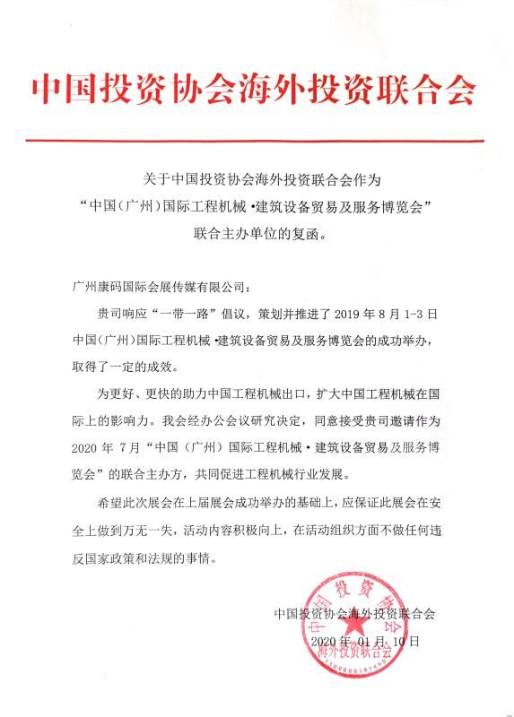 2019年開展的致力于促進(jìn)“工程機(jī)械、建筑設(shè)備國(guó)際貿(mào)易與服務(wù)”的康馬展的成功舉行后,展會(huì)承辦方康馬網(wǎng)董事長(zhǎng)劉智向中國(guó)投資協(xié)會(huì)海外投資聯(lián)合會(huì)(簡(jiǎn)稱海合會(huì))劉雄英會(huì)長(zhǎng)匯報(bào)展會(huì)工作,會(huì)長(zhǎng)對(duì)展會(huì)發(fā)展給予了充分肯定的同時(shí)欣然接受康馬申請(qǐng),同意作為2020年康馬展聯(lián)合主辦方,給康馬展注入更多海外資源、開拓展會(huì)各方渠道,相信在海合會(huì)聯(lián)合主辦指導(dǎo)下,2020康馬展將打造成具備國(guó)際影響力的工程建筑機(jī)械國(guó)際貿(mào)易標(biāo)桿展會(huì)。
