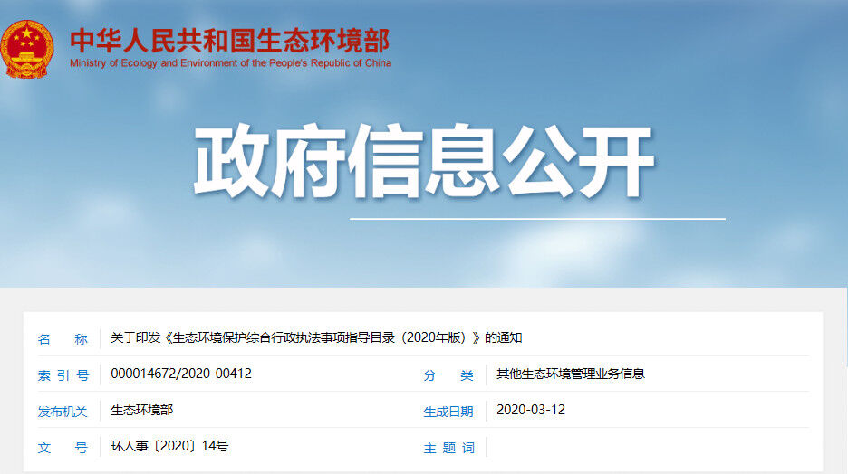 近日,生態(tài)環(huán)境部發(fā)布了關(guān)于印發(fā)《生態(tài)環(huán)境保護(hù)綜合行政執(zhí)法事項(xiàng)指導(dǎo)目錄(2020年版)》(以下簡(jiǎn)稱“《指導(dǎo)目錄》”)的通知,稱根據(jù)深化黨和國家機(jī)構(gòu)改革有關(guān)安排部署,為貫徹落實(shí)《國務(wù)院辦公廳關(guān)于生態(tài)環(huán)境保護(hù)綜合行政執(zhí)法有關(guān)事項(xiàng)的通知》(國辦函〔2020〕18號(hào))要求,扎實(shí)推進(jìn)生態(tài)環(huán)境保護(hù)綜合行政執(zhí)法改革,現(xiàn)印發(fā)《生態(tài)環(huán)境保護(hù)綜合行政執(zhí)法事項(xiàng)指導(dǎo)目錄(2020年版)》及說明。