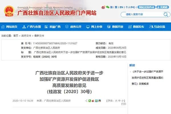 近日,廣西壯族自治區(qū)人民政府發(fā)布《關(guān)于進(jìn)一步加強(qiáng)礦產(chǎn)資源開發(fā)保護(hù)促進(jìn)我區(qū)高質(zhì)量發(fā)展的意見》,針對(duì)自治區(qū)礦業(yè)開發(fā)布局不合理、規(guī)模化水平不高、粗放利用和生態(tài)環(huán)境保護(hù)不到位等問題提出若干建議,努力加強(qiáng)礦產(chǎn)資源開發(fā)保護(hù),提高礦產(chǎn)資源有序開發(fā)和綜合利用水平。
