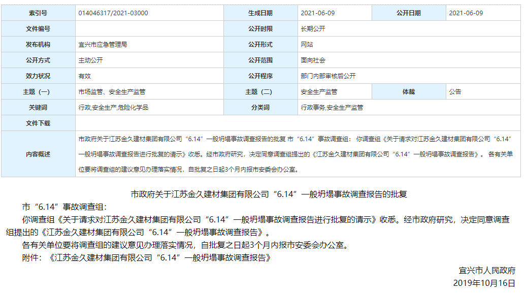 2021年6月9日,江蘇省宜興市人民政府官網(wǎng)發(fā)布《關(guān)于江蘇金久建材集團(tuán)有限公司“6.14”一般坍塌事故調(diào)查報(bào)告的批復(fù)》,對(duì)一起因筒庫(kù)坍塌造成2死1傷的事故進(jìn)行通報(bào)。