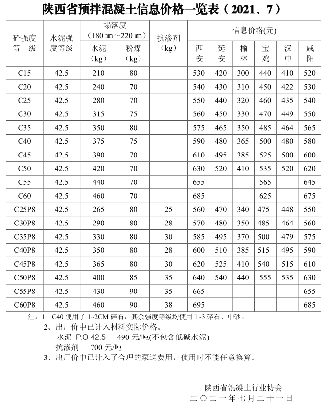 【市場】陜西省預(yù)拌混凝土信息價(jià)格一覽表(2021.7)