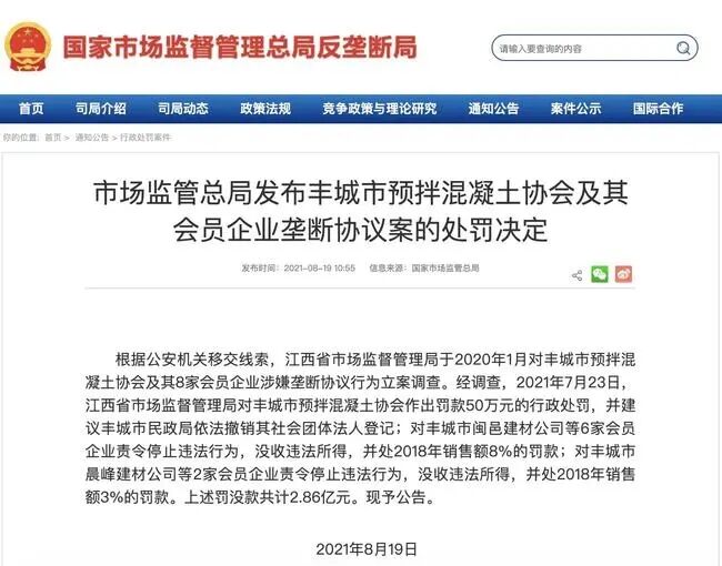 8月18日,國家市場監(jiān)管總局發(fā)布通報,江西省市場監(jiān)督管理局對豐城市預拌混凝土協(xié)會及其會員企業(yè)壟斷協(xié)議一案,合計罰沒約2.86億元。