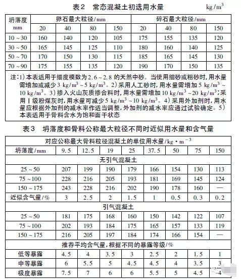 1)根據(jù)混凝土的暴露等級決定其是否需要引氣,再分別針對引氣混凝土和無引氣混凝土,根據(jù)施工要求的工作度和骨料最大粒徑初選用水量和含氣量;