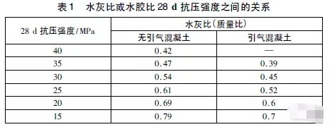當無試驗資料可用時,對于含有Type1波特蘭水泥(硅酸鹽水泥)的混凝土,可以在表1中得到近似和相對固定的數(shù)據(jù)。用有代表性的材料,在試驗室標準養(yǎng)護條件下試驗28d的試塊,表1中的水膠比可以得到與之對應(yīng)的強度。