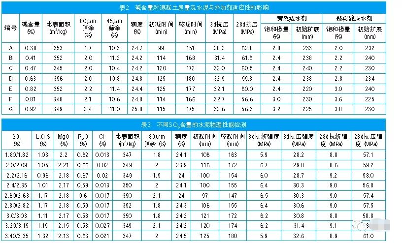在水泥熟料礦物當中,C3A的水化速度是最快的,它在水化作用時,能離解出Al3+,使水化物形成的膠體溶液發(fā)生凝聚。當加入石膏以后,可以和C3A很快化合,生成硫鋁酸鈣晶體,使凝結(jié)時間延緩。在石膏摻量過高時,C3A電離出的Al3+雖然很快消失,但是硫酸鈣電離出來的Ca2+又起凝結(jié)作用,同樣產(chǎn)生促凝作用,生成硫鋁酸鈣,產(chǎn)生體積膨脹,會使已硬化的水泥石強度降低,甚至使構(gòu)件開裂。因此,在粉磨水泥時要控制石膏的摻加量。從表3可知,水泥中SO3含量從1.8%~2.8%范圍內(nèi),凝結(jié)時間未體現(xiàn)規(guī)律性變化,在3.0%~3.4%,凝結(jié)時間有一定延長,但總體幅度不大,約10min~20min。隨著SO3含量的增加,3d及28d強度總體略呈增加趨勢,但幅度較小。從混凝土適應性試驗分析中得出:使用萘系減水劑時,隨著SO3含量的不斷增加,減水劑的飽和摻量變化不明顯,初始擴展度變化不大,經(jīng)時損失率總體變小。使用聚羧酸系減水劑時,隨著SO3含量的不斷增加,減水劑的飽和摻量整體呈現(xiàn)下降趨勢,在同一摻量下,凈漿呈現(xiàn)初始擴展趨小變化,經(jīng)時均出現(xiàn)返大現(xiàn)象。綜合考慮水泥強度、凝結(jié)時間及水泥及減水劑的適應性:水泥中SO3含量可控制在2.2%~2.8%之間。除上述水泥比表面積、R2O、SO3對混凝土質(zhì)量有直接影響外,其它品質(zhì)指標對混凝土質(zhì)量也有影響:水泥需水量易引起混凝土強度變化,影響混凝土耐久性、和易性;水泥強度波動過大,則容易造成混凝土強度不合格;水泥粉磨工藝和顆粒分布等對混凝土質(zhì)量也有明顯影響。從混凝土使用角度,需進一步實驗和研究,控制好水泥質(zhì)量。