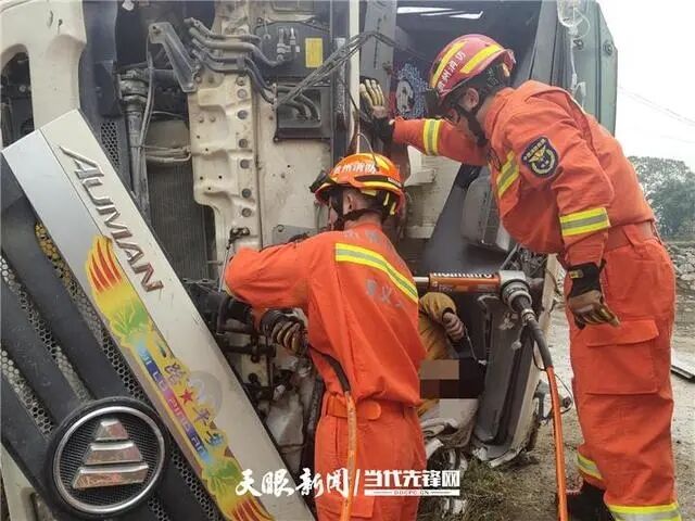 到達現(xiàn)場后,指揮員立即下車對現(xiàn)場情況進行偵查,發(fā)現(xiàn)事故車輛是一臺裝滿了35噸混凝土的罐車,由于雨天路滑,司機行駛到一段下坡路時因操作不當發(fā)生側(cè)翻。駕駛員被困在駕駛室內(nèi),駕駛室已嚴重變形,無法將車門正常開啟,現(xiàn)場醫(yī)護人員正為司機輸液補充能量。