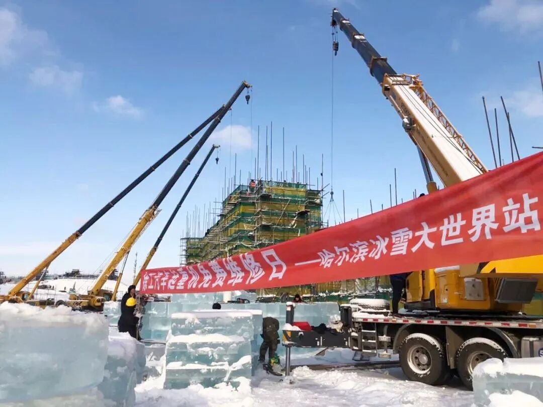 第21屆哈爾濱冰雪大世界建設現(xiàn)場,XCT25、QY25K5-1、QY70k-1在內(nèi)的50多臺徐工起重設備將無數(shù)個“量重面滑”、重達一噸的冰塊無縫堆砌。