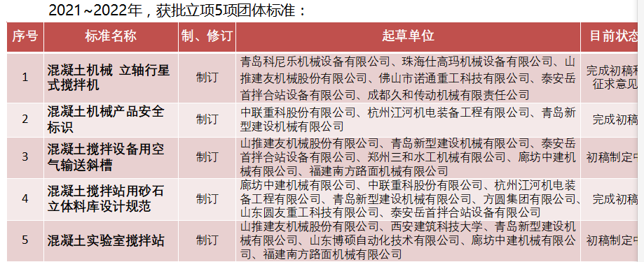 2022年召開(kāi)第五屆中國(guó)工程機(jī)械工業(yè)協(xié)會(huì)標(biāo)準(zhǔn)化專(zhuān)家委員會(huì)(混凝土機(jī)械)全體會(huì)議,加強(qiáng)和促進(jìn)與會(huì)單位流,充分發(fā)揮專(zhuān)家委員作用,共同堆進(jìn)團(tuán)體標(biāo)準(zhǔn)發(fā)展。