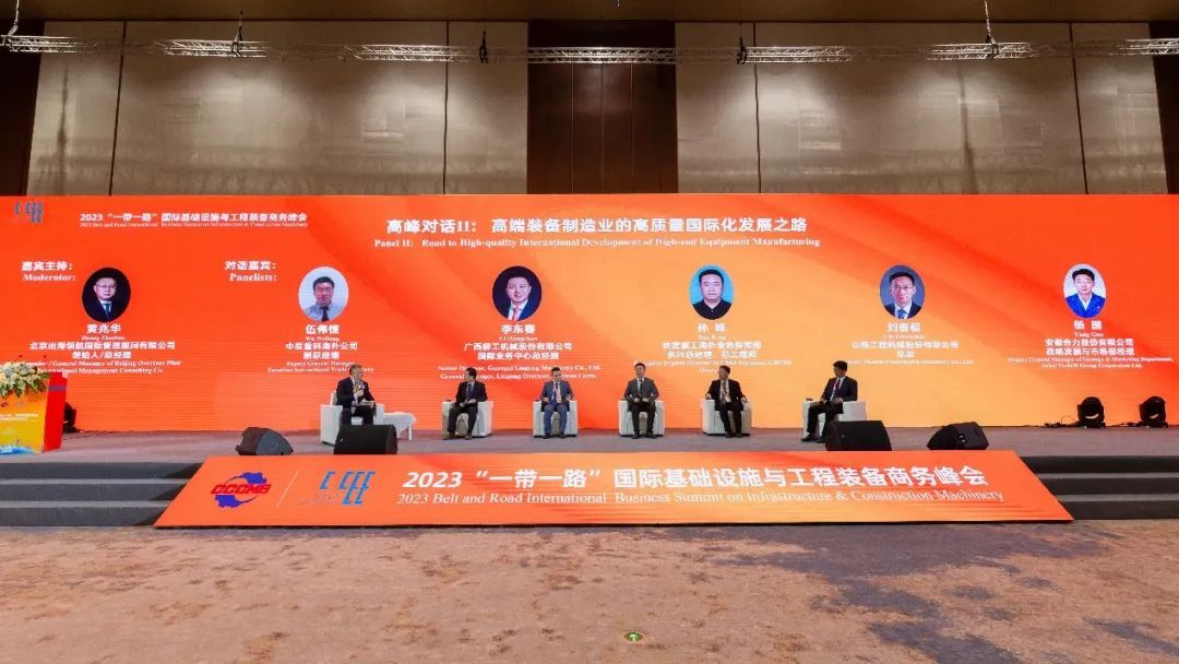 第二場(chǎng)高峰對(duì)話由北京出海領(lǐng)航國(guó)際管理顧問(wèn)有限公司創(chuàng)始人、總經(jīng)理黃兆華主持,邀請(qǐng)中聯(lián)重科、廣西柳工、山推、鐵建重工、安徽合力公司高管,圍繞“高端裝備制造業(yè)的高質(zhì)量國(guó)際化發(fā)展之路”展開(kāi)對(duì)話交流,對(duì)話嘉賓聚焦后疫情時(shí)代國(guó)際基礎(chǔ)設(shè)施發(fā)展的機(jī)遇,分享工程裝備制造業(yè)高質(zhì)量發(fā)展的經(jīng)驗(yàn)和建議。