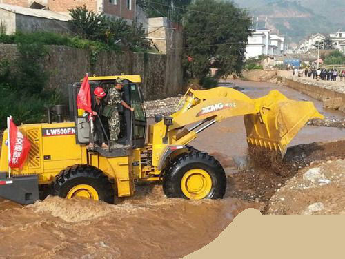 徐工救援隊員早已為車輛做好了一切前期準備,按照指揮部安排,此臺徐工LW500FN裝載機參與清理災區(qū)因塌方被堵塞的河道,并在河道中進行鋪設(shè)快速通道工作,從河道中央開出一條水上救援之路。至上午11點,徐工裝載機高效出色地順利完成了任務(wù),不僅排除了水災隱患,更在河道中修出一條“生命線”,使后續(xù)救護車、武警車等救援車輛可以通過這條簡易通道直抵震中,為被困被埋群眾在72小時黃金救援時間內(nèi)獲救爭取到了更多時間。