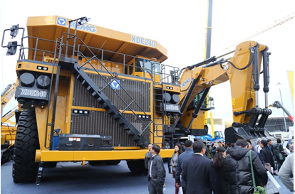 徐工在bauma2014上展出XDE240大型電傳動礦用自卸車,該車載重量230t,額定功率2500hp,發(fā)動機(jī)配置MTU16v4000,發(fā)電機(jī)采用GE GTA-41,牽引電機(jī)采用GE B25,輪邊減速比為31.8:1,采用交—直—交電傳動技術(shù)