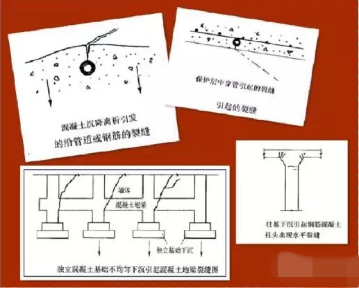混凝土裂縫是由于混凝土結構由于內(nèi)外因素的作用而產(chǎn)生的物理結構變化,包括塑性塌落裂縫、塑性收縮(干縮)裂縫、溫度裂縫等。