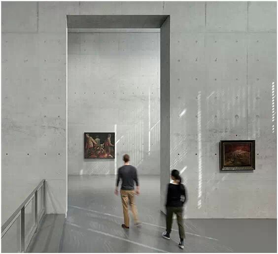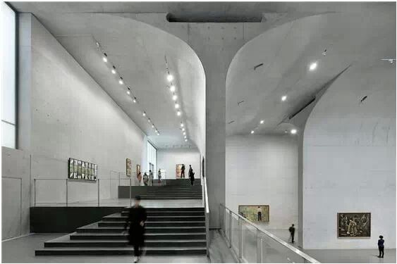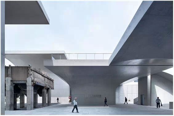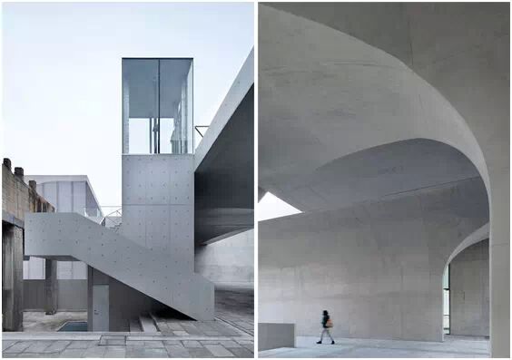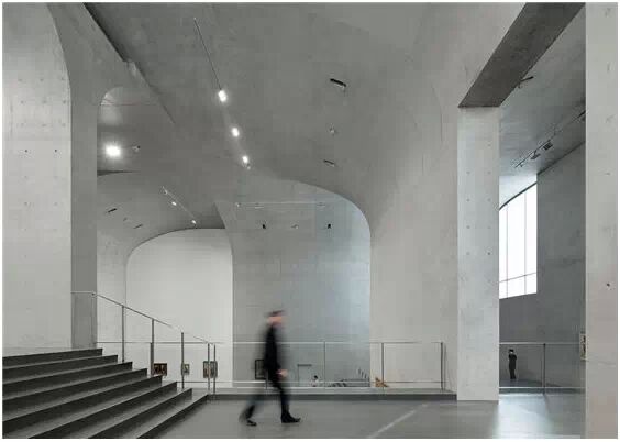 在“傘拱”結(jié)構(gòu)的空腔里,地面以上的“傘拱”覆蓋空間,墻體和天花均為清水混凝土的表面,它們的幾何分界位置也變得模糊。這樣的結(jié)構(gòu)性空間,在形態(tài)上不僅對人的身體形成庇護感,亦與保留的江邊碼頭的煤料斗產(chǎn)生視覺呼應。建筑的內(nèi)部空間也得以呈現(xiàn)一種原始的野性魅力,而有著大小調(diào)節(jié)的空間尺度以及留有模板拼縫和螺栓孔的清水混凝土表面又會帶來一種現(xiàn)實感。這種“直白”式的結(jié)構(gòu)、材料、空間所形成的直接性與樸素性,加上大尺度出挑所產(chǎn)生的力量感或輕盈感,使整個建筑與原有場地的工業(yè)特質(zhì)間取得一種時間與空間的接續(xù)關(guān)系。地面以上的清水混凝土“傘拱”下的流動展覽空間和地下一層傳統(tǒng)“白盒子”式的展覽空間由一個呈螺旋回轉(zhuǎn)、層層跌落的階梯空間聯(lián)接,既原始又現(xiàn)實的空間和古代、近代、現(xiàn)代直到當代藝術(shù)的展覽陳列,這種并置的張力,呈現(xiàn)出一種具有時間性的展覽空間。
