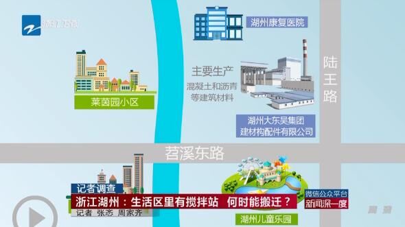 湖州大東吳集團建材構配件有限公司位于湖州市苕溪東路和陸王陸交叉口北側,主要生產(chǎn)混凝土和瀝青等建筑材料。在它的西面,隔著一條河,就是萊茵園小區(qū)和尊園小區(qū)。它的北面是湖州康復醫(yī)院和養(yǎng)老院,南面則是即將竣工的湖州兒童樂園(圖)