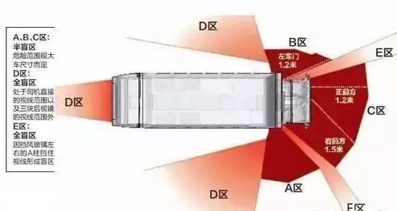 一般情況下,大貨車司機(jī)的視野可分為半盲區(qū)和全盲區(qū)。半盲區(qū)為左車門1.2米、右前方1.5米、正前方1.2米;全盲區(qū)為車正后方。