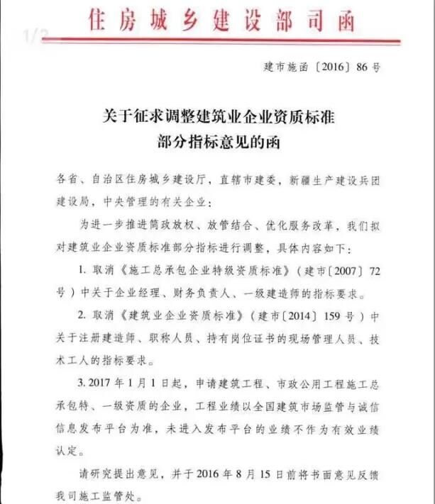 近日,住房和城鄉(xiāng)建設(shè)部建筑市場(chǎng)監(jiān)管司就“調(diào)整建筑業(yè)企業(yè)資質(zhì)標(biāo)準(zhǔn)部分指標(biāo)”征求意見(建市施函[2016]86號(hào)),主要內(nèi)容有以下兩點(diǎn):