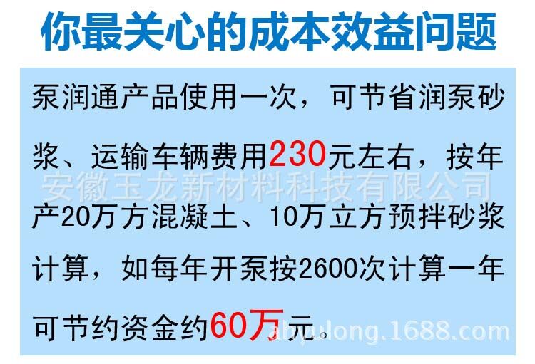 泵潤通產(chǎn)品使用一次,可節(jié)省潤泵砂漿、運輸車輛費用230元左右,按年產(chǎn)20萬方混凝土、10萬立方預(yù)拌砂漿計算,如每年開泵按2600次計算一年可節(jié)約資金約60萬元。