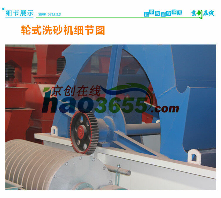 工作時(shí),電機(jī)通過三角帶、減速機(jī)、齒輪減速后帶動(dòng)葉輪緩慢轉(zhuǎn)動(dòng),砂石有給料槽進(jìn)入洗槽中,在葉輪的帶動(dòng)下翻滾,并互相研磨,除去覆蓋砂石表面的雜質(zhì),同時(shí)破壞包覆砂粒的水汽層,以利于脫水;同時(shí)加水,形成強(qiáng)大水流,及時(shí)將雜質(zhì)及比重小的異物帶走,并從溢出口洗槽排出,完成清洗作用。干凈的砂石由葉片帶走,最后砂石從旋轉(zhuǎn)的葉輪倒入出料槽,完成砂石的清洗作用。