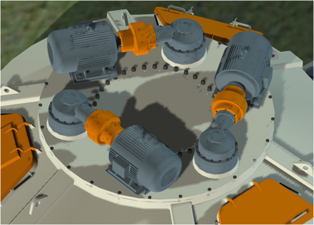 ④對于大型立軸行星式攪拌主機,我們采用多電機驅(qū)動,其起動平穩(wěn)、可靠性高。獨特的電機臥式安裝結(jié)構(gòu),有效降低了攪拌主機的整體高度,方便運輸和安裝及攪拌主機進料系統(tǒng)布局,維修更加簡便,該主機結(jié)構(gòu)設(shè)計我公司已獲專利。