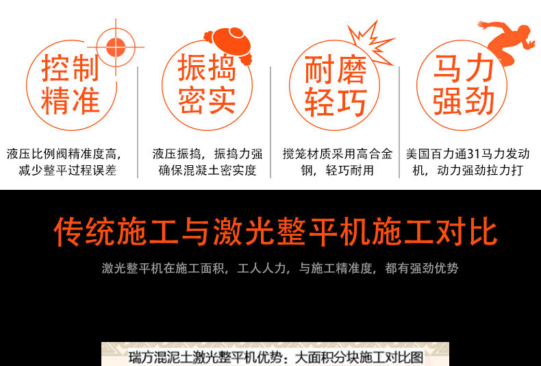 奧力德激光整平機是根據(jù)現(xiàn)代工業(yè)廠房、大型商場、 及其他大面積水泥混凝土地面等對地面質(zhì)量如 、平整度、水平度等越來越高的需求而研制的。使用精密激光整平機鋪注整平的水泥混凝土地面,較按常規(guī)方法所鋪注的地面質(zhì)量要好得多——地面平整度及水平度提高3倍以上,密實度及強度提高20%以上。同時還能夠提高工效超過50% , 并節(jié)省約35%的人工。此外,它能容易地鋪注高強 、低坍落度混凝土和纖維泥凝土。其激光系統(tǒng)配備多種自動控制元件,以每秒10次的 實時監(jiān)測整平頭的標高,確保鋪注的地面平整度和水平度得到有效的控制。同時,其強力振動器振動頻率達4000次/分鐘,確?;炷琳駬v密實,使整個鋪注的混凝土基體均質(zhì)、致密