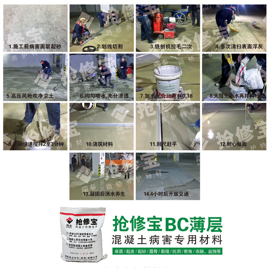 出現(xiàn)這些問題的主要原是因為施工質(zhì)量和產(chǎn)品本身的使用壽命問題,那么針對這種問題,地坪在修補處理基層時應(yīng)該選擇什么材料呢?首先應(yīng)考慮快速材料,因為是地下停車場,車輛需要頻繁進入駛出;其次針對起塵、起砂、脫落的微表處病害,選擇針對微表處病害的修補材料。搶修寶BC薄層就是一個不錯的選擇,材料本身強度高,內(nèi)含進口膠粉,可以和病害部位嚴絲合縫的結(jié)合起來,其次加入了進口添加劑,材料可以30分鐘完成初凝,2-4小時就可以恢復交通,解決了車輛進出頻繁引起的交通擁堵,是地坪修補基層處理的的不錯的選擇!