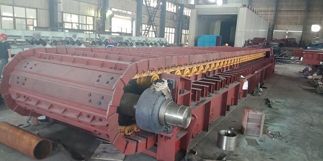 近年來, 對板式給料機(jī)的需求量不斷擴(kuò)大, 除了作為給料機(jī)使用外, 逐漸也用來轉(zhuǎn)運物料。從幾年來的供貨及需求情況看, 除訂貨量增大外, 也要求長度增大,板式給料機(jī)長度已達(dá)30米以上, GBL中型長度也超過20米.因此, 整體式機(jī)架已不能滿足用戶要求, 可采用分段裝配式, 即分標(biāo)堆節(jié)非標(biāo)準(zhǔn)節(jié)頭節(jié)和尾節(jié), 這樣便于制造安裝和運輸,另外尾節(jié)部分應(yīng)配置受料漏斗.