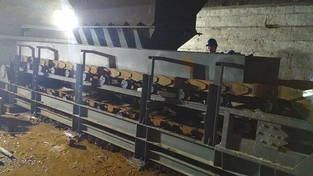3)第三種方法是將刮板輸送機固定在板式給料機下面的水泥基礎溝槽內,漏料通過漏斗進入刮板輸送機內。