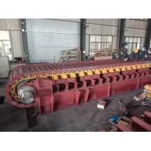 負荷鏈板材料選用優(yōu)質(zhì)合金鋼板沖壓而成。給料板式給料機每塊負荷鏈板上焊有折彎角鐵,既能滿足大傾角向上運送物料,又提高負荷鏈板的強度。在鏈板寬度較寬的情況下增加輔助支撐,該項結(jié)構(gòu)不但增加了鏈板的強度,而且使運輸過程更加平穩(wěn)可靠。拉料板式給料機為了增加鏈板表面的摩擦,防止物料打滑,在負荷鏈板上增加了一定數(shù)量的耙齒,對防止搭橋有一定的緩沖作用,保證了給料的均勻性。