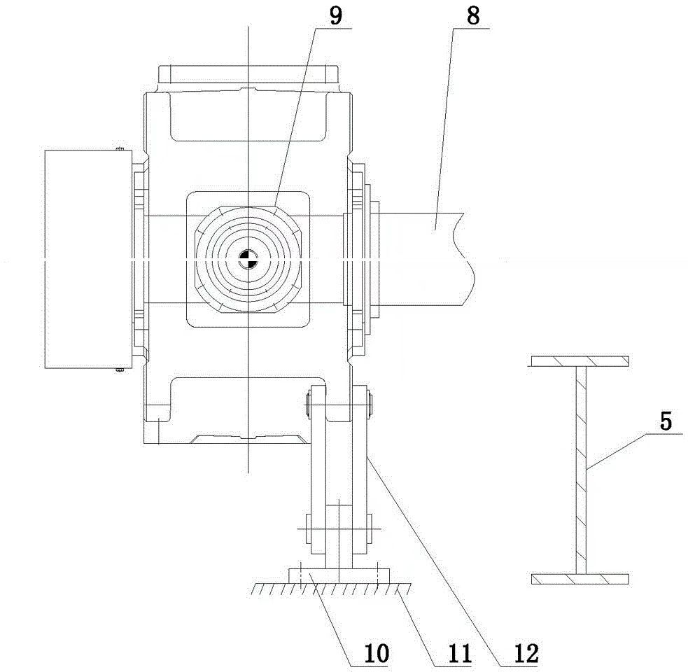 現(xiàn)有的重型板式給料機驅(qū)動機構結構如圖2所示,包括驅(qū)動機構9,驅(qū)動機構9下端設置扭力臂12,扭力臂12下端設置有連接座10,連接座10與地基11相連;其驅(qū)動機構9與重板主體5之間不相連。由于重型板式給料機工況惡劣、振動較大,驅(qū)動機構9單獨與地基11相連,造成驅(qū)動機構9的震動與主機的震動不同步,因此,這種不同步的震動對鏈輪軸8傷害較大,嚴重時可導致鏈輪軸8斷裂。