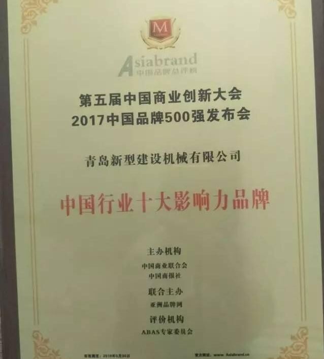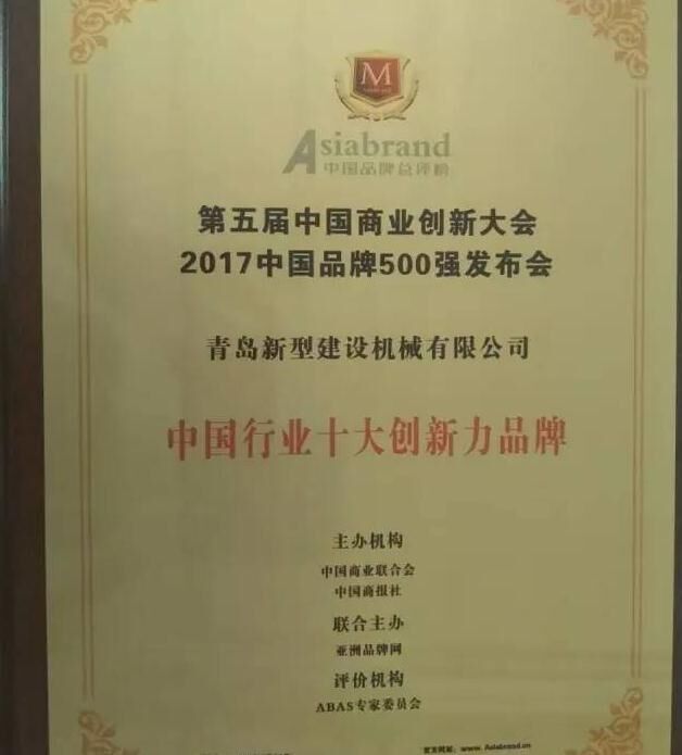 2017年5月31日,以“新品牌、新供給、新未來”為主題的第五屆中國(guó)商業(yè)創(chuàng)新大會(huì)暨2017中國(guó)品牌500強(qiáng)發(fā)布會(huì)在北京國(guó)家會(huì)議中心隆重舉行。建筑機(jī)械行業(yè)知名企業(yè)中青林集團(tuán)旗下青島新型建設(shè)機(jī)械有限公司受邀參會(huì),一舉榮獲“中國(guó)行業(yè)十大創(chuàng)新力品牌”與“中國(guó)行業(yè)十大影響力品牌”。