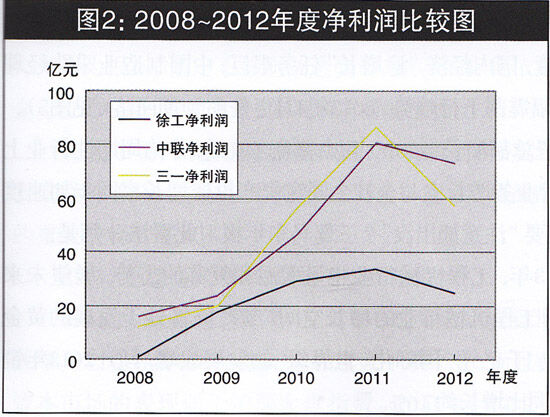 分析工程機(jī)械上市公司三駕馬車5年主要會(huì)計(jì)數(shù)據(jù)表明(見表1):中聯(lián)連續(xù)5年實(shí)現(xiàn)營業(yè)收入增長,徐工、三—在實(shí)現(xiàn)4年?duì)I業(yè)收入連續(xù)增長后,2012年?duì)I業(yè)收入出現(xiàn)負(fù)增長。從表1可知,三家上市公司凈利潤指標(biāo),均在實(shí)現(xiàn)連續(xù)4年上漲后,于2012年同時(shí)出現(xiàn)負(fù)增長。從圖1、圖2可見三駕馬車2008年、2012年?duì)I業(yè)收入、凈利潤排名一致,分別是中聯(lián)、三一、徐工,而在五年中的2009、2010、2011三年,以上排名互有消長。比較主營業(yè)務(wù)十分接近的兩家上市公司三一和中聯(lián),我們發(fā)現(xiàn):在五年之中,當(dāng)GDP增長率走高時(shí),三一的主營業(yè)務(wù)收入增長率、凈利潤增長率高于中聯(lián),在經(jīng)濟(jì)下行壓力增大,GDP增長率走低時(shí),中聯(lián)的收入增長,具有相對(duì)穩(wěn)定性(見圖1)。