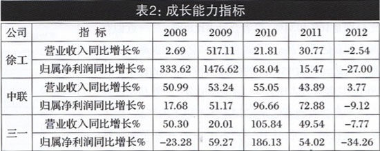 公司的成長與盈利能力正相關(guān)。在年報(bào)中,主營業(yè)務(wù)收入增長率、凈利潤增長率、凈資產(chǎn)增長率以及凈資產(chǎn)收益率、毛利率、凈利率等財(cái)務(wù)指標(biāo),是判斷企業(yè)成長性和盈利能力的重要指標(biāo)。表2顯示,三駕馬車中,5年主營業(yè)務(wù)收入同比增長率實(shí)現(xiàn)連續(xù)5年正增長、連續(xù)三年保持30%以上增長率的公司是中聯(lián),五年中增長率振幅最大的公司是徐工,2012年徐工和三—主營業(yè)務(wù)收入增長率均出現(xiàn)負(fù)增長;表2還顯示,凈利潤同比增長率方面,沒有—家公司連續(xù)五年正增長,2012年三駕馬車同時(shí)出現(xiàn)負(fù)增長,三一錄得-34.26%的最大降幅。在大環(huán)境不利因素作用下,公司成長性受到嚴(yán)峻挑戰(zhàn)(見圖2)。