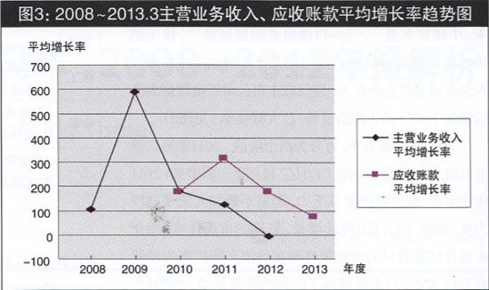 圖3 2008~2013.3主營業(yè)務(wù)收入、應(yīng)收賬款平均增長率趨勢(shì)圖
